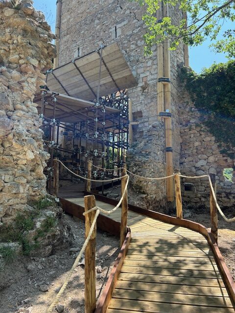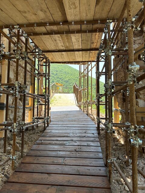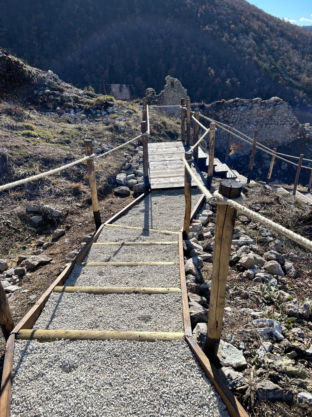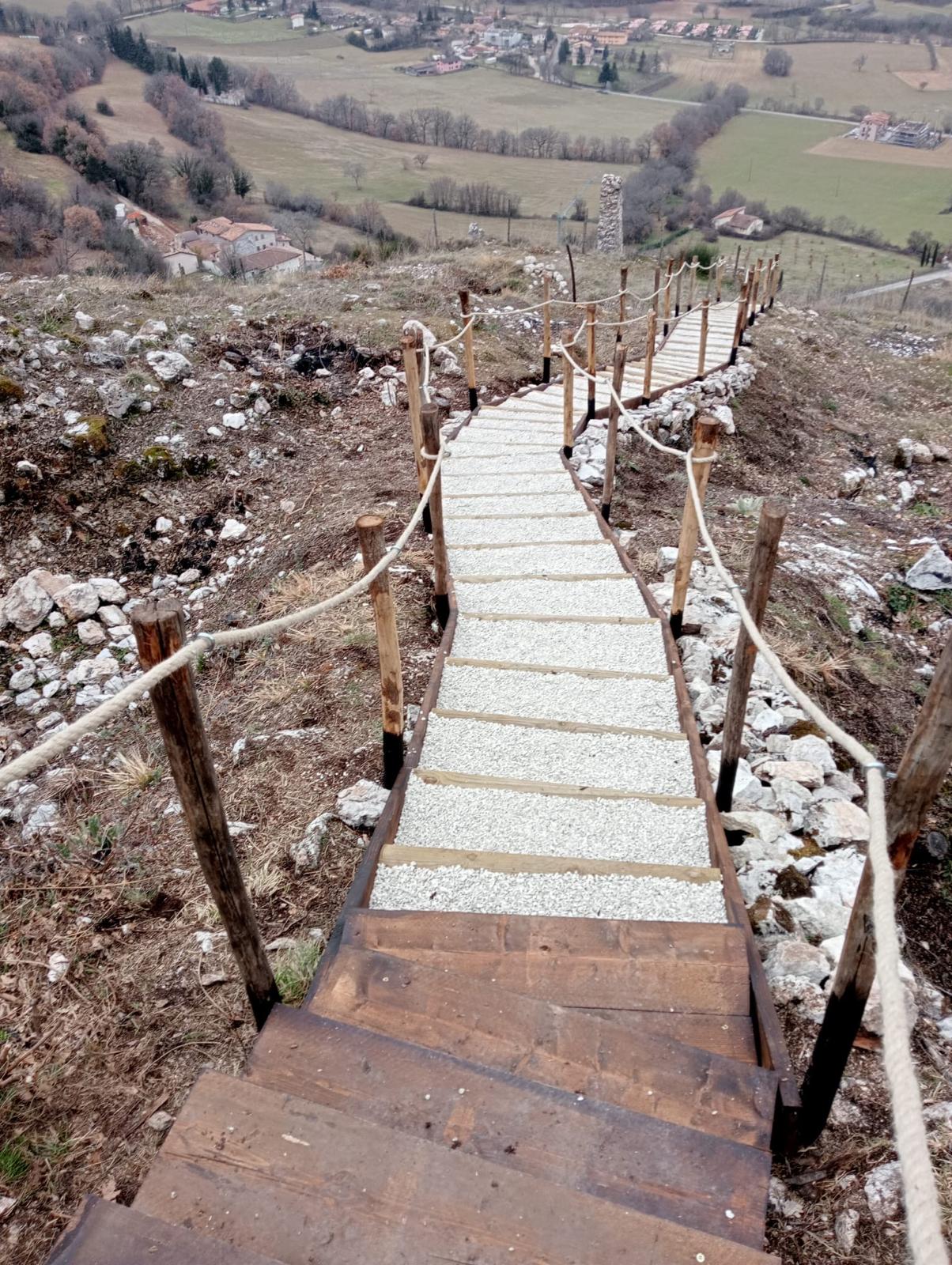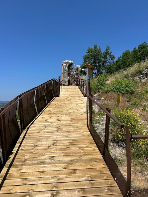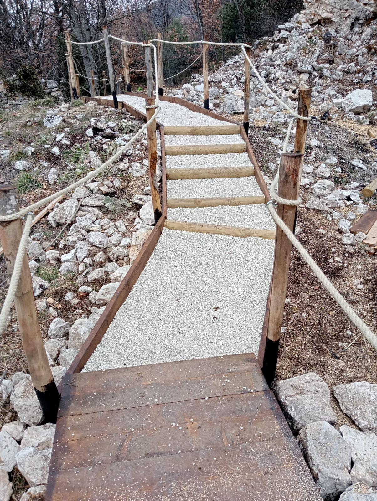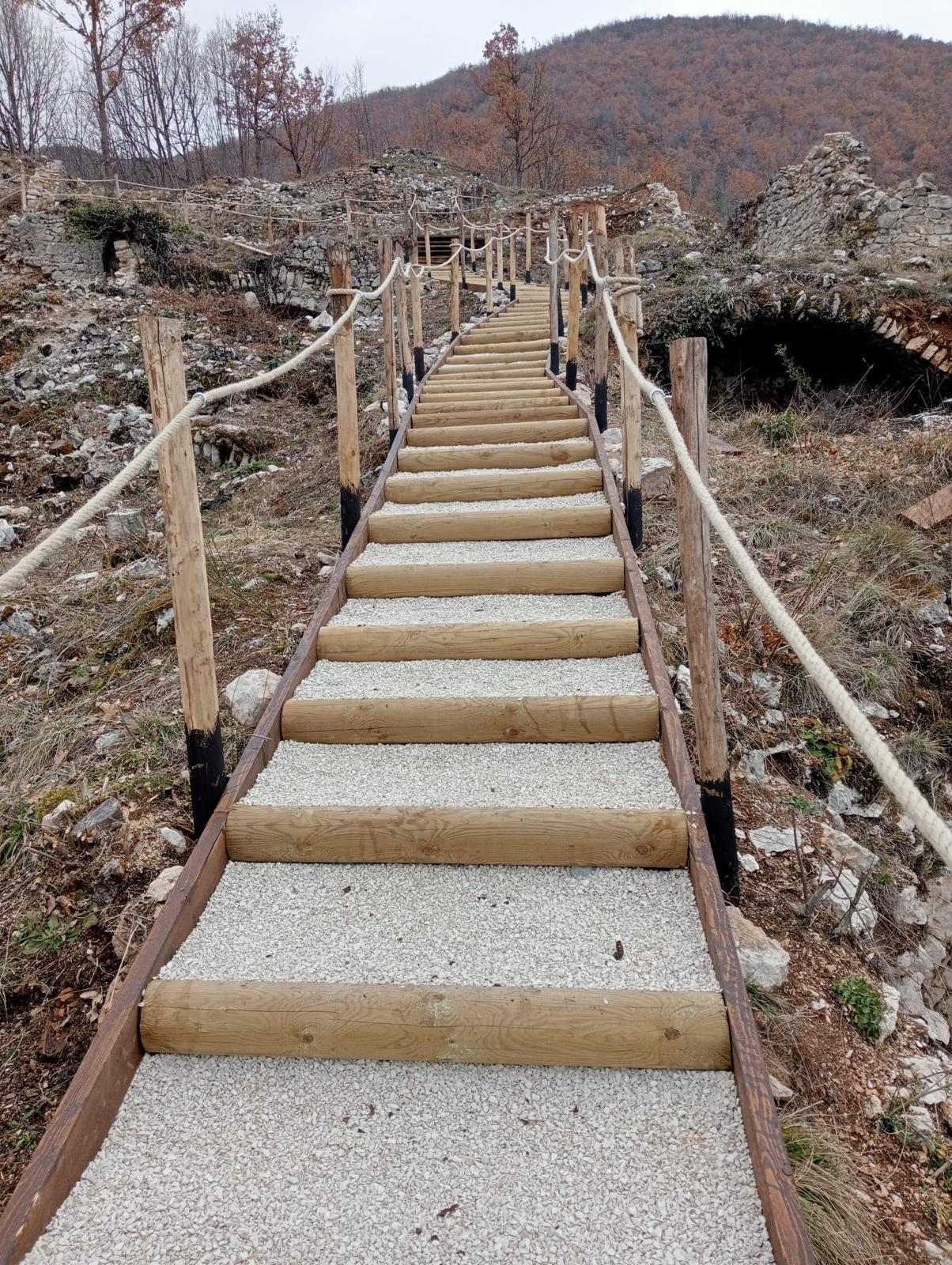 Il percorso che sarà realizzato permetterà l’ingresso e la visita dei ruderi in sicurezza, scavalcando la cinta muraria con delle scalette in legno e scenderà verso la parte centrale percorrendo una lunghezza di circa 80 mt., con una larghezza media di ml. 1,00, intervallato e delimitato da sponde in tavole / tronchetti di legno (atte a contenere il ghiaietto per una migliore percorribilità)